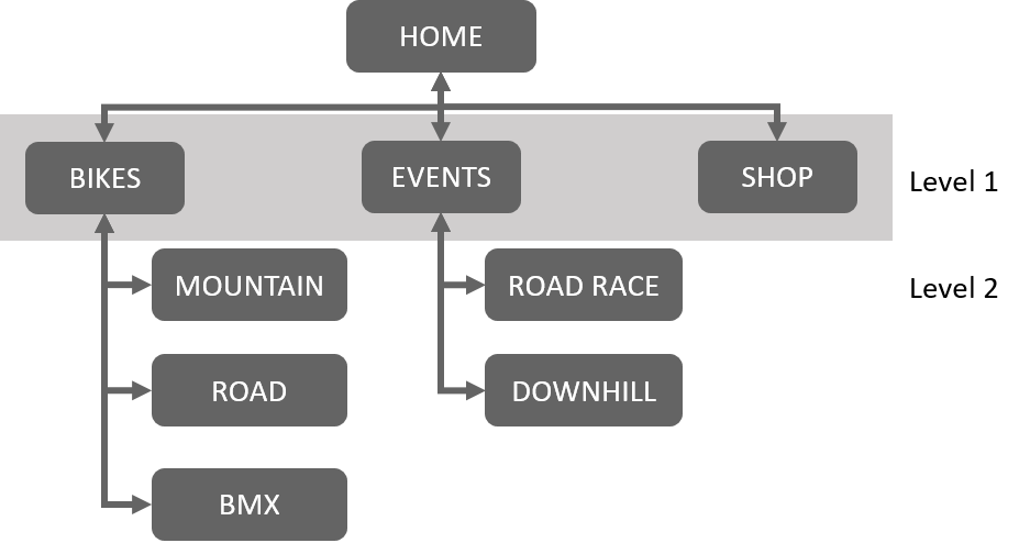 At Higher level, we expand on the N5 diagram to show a multi-level website as well as highlighting the level for pages. You can see in the example below that the first set of pages is considered level 1, this is also the navigation that the user will see on the homepage. The subpages of level 1 are therefore level 2.