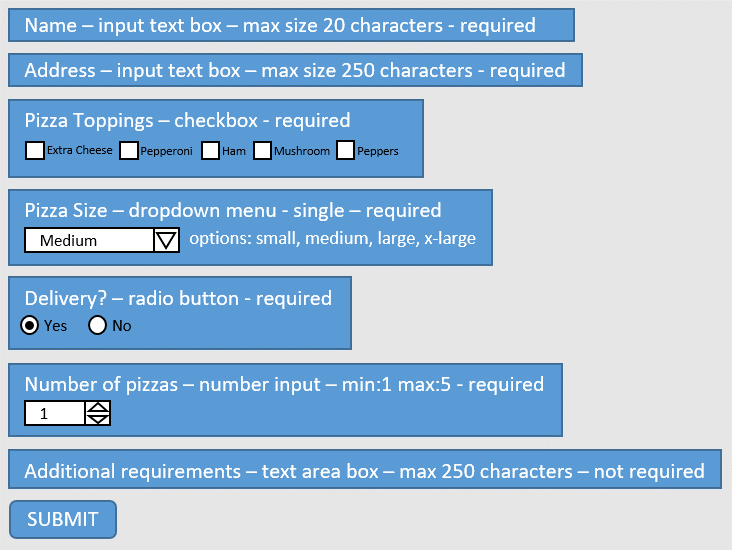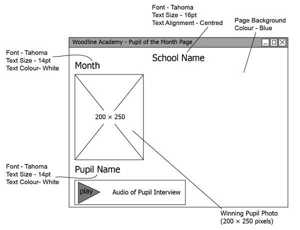 Wireframes are used to plan the final layout of the webpages in the website. They are usually done with pencil and paper to sketch out a brief design, but can do be done digitally. At higher you will be expected to produce wireframes for both a website/webpage and a form.