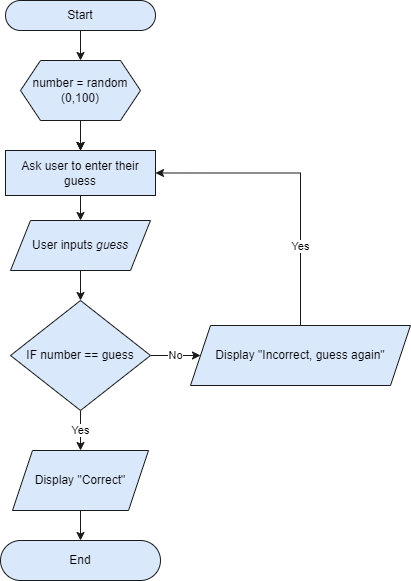 Here is an example of a flowchart for a number guessing game;