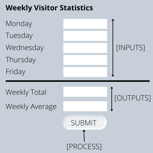 - Outputs - results or messages displayed to the user.